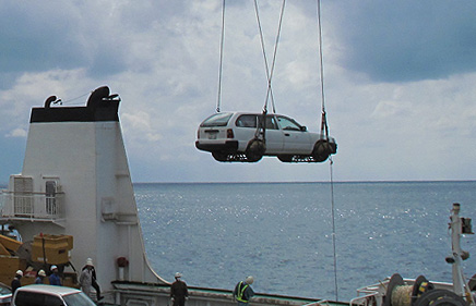 人が乗る鉄の檻がぐわーんとフェリーに寄ってくる。