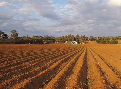 夕焼けで刈られたばかりのサトウキビ畑が赤く染まっていた。