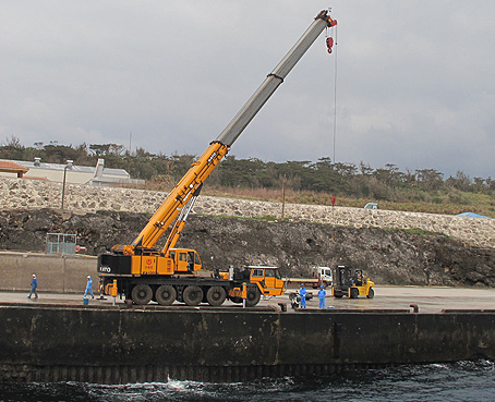 大東では岸壁へのロープの固定が大変なのだが、さらに海にある浮き輪にもロープをつないでいる。